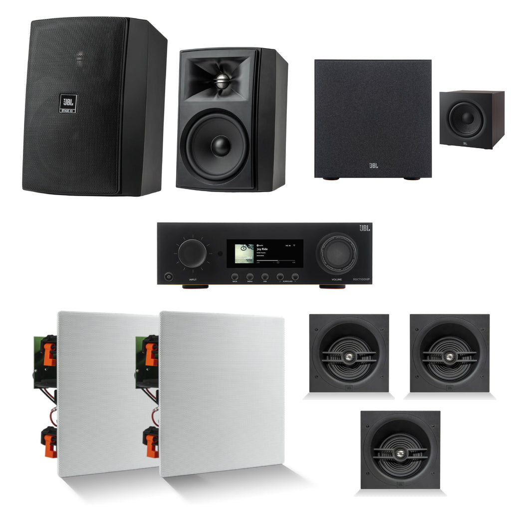 Este kit é uma solução de alta performance que combina um sistema de Home Theater 5.1 imersivo para a sala com a sonorização de uma área externa, tudo controlado pelo mesmo equipamento.