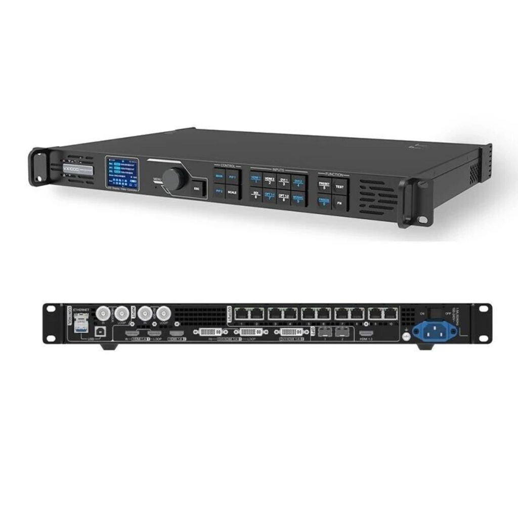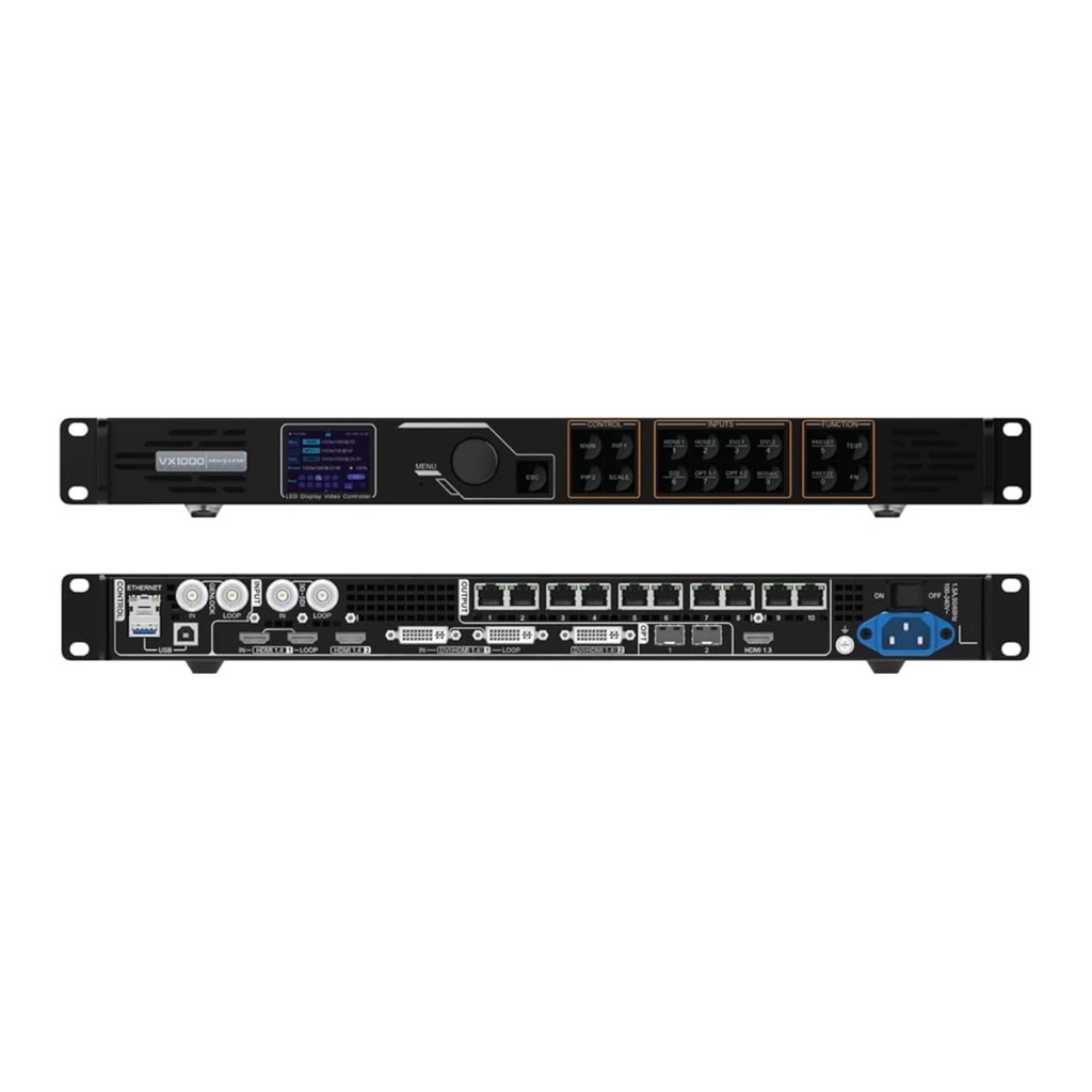 A NovaStar VX1000 é uma controladora "tudo-em-um" que integra o processamento de vídeo e o controle do painel de LED em um único dispositivo, sendo uma solução profissional e versátil para aplicações de médio e grande porte, como eventos, locação e instalações fixas de alta resolução.